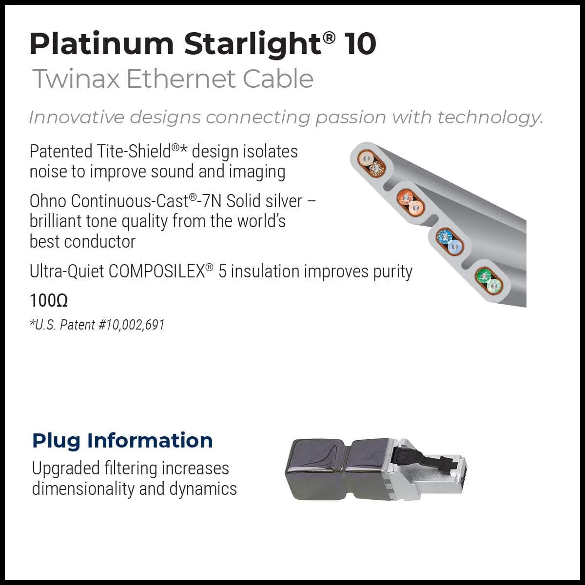 De Platinum Starlight 10 is bij uitstek geschikt voor veeleisende gebruikers die hun digitale netwerk willen optimaliseren met de allerbeste bekabeling. Combineer deze kabel met premium streamers zoals Eversolo, Aurender, Lumin, Rose en Innuos voor een opmerkelijk verbeterde geluidsbeleving.